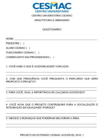 O projeto teve como objetivo apresentar uma proposta visando melhores condições de acessibilidade aos indivíduos P.N.E (Portadores de Necessidades Especiais) de acordo com a norma ABNT NBR 9050 – 2015, a proposta final conta com o desenvolvimento de calçadas adequadas para uso no ambiente do CESMAC, na Rua Cônego Machado. Desta maneira, a comunidade seria beneficiada através de espaços e serviços que oferecessem condições seguindo as recomendações determinadas por lei; assegurando a todos os cidadãos uma vida integrada à comunidade em igualdade, com o objetivo de construir uma formação de alunos e cidadãos melhores.